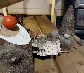 Saunatonttu. Saunatontut ovat saaneet pitää asumuksensa, koska onneksi suomalaiset rakastavat saunomista. Sähkösaunat ovat vallanneet tieltään perinteiset puulla lämpiävät saunan kiukaat. Mutta tällä saunatontulla on tehtävänään huolehtia, että saunan puut on kuivia. Tänään talli-tonttu Ukko oli auttamassa Saunatonttua puiden kannossa.