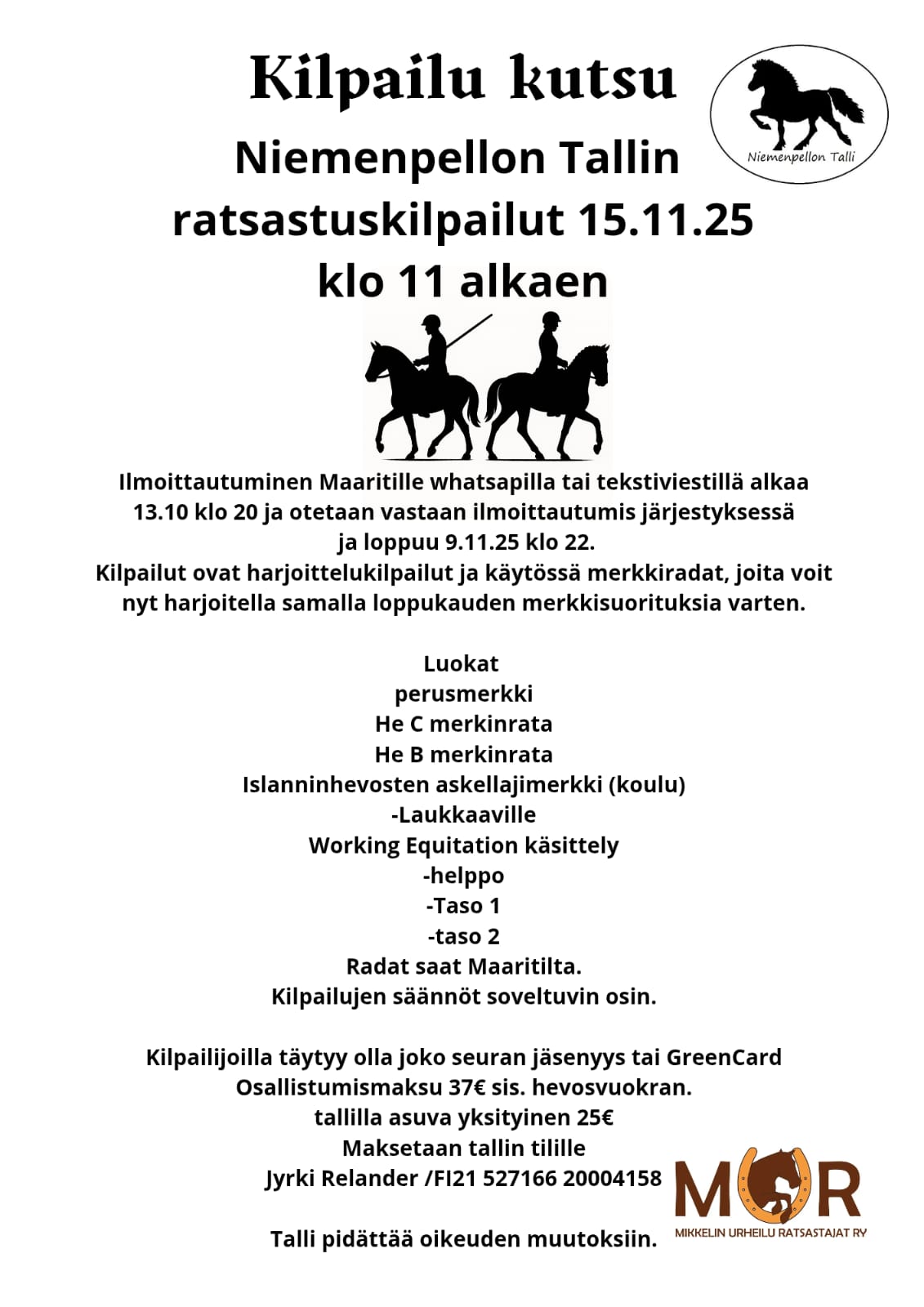 Osallistumismaksu on samalla hevosen varausmaksu (sitä ei palauteta syystä riippumatta ).